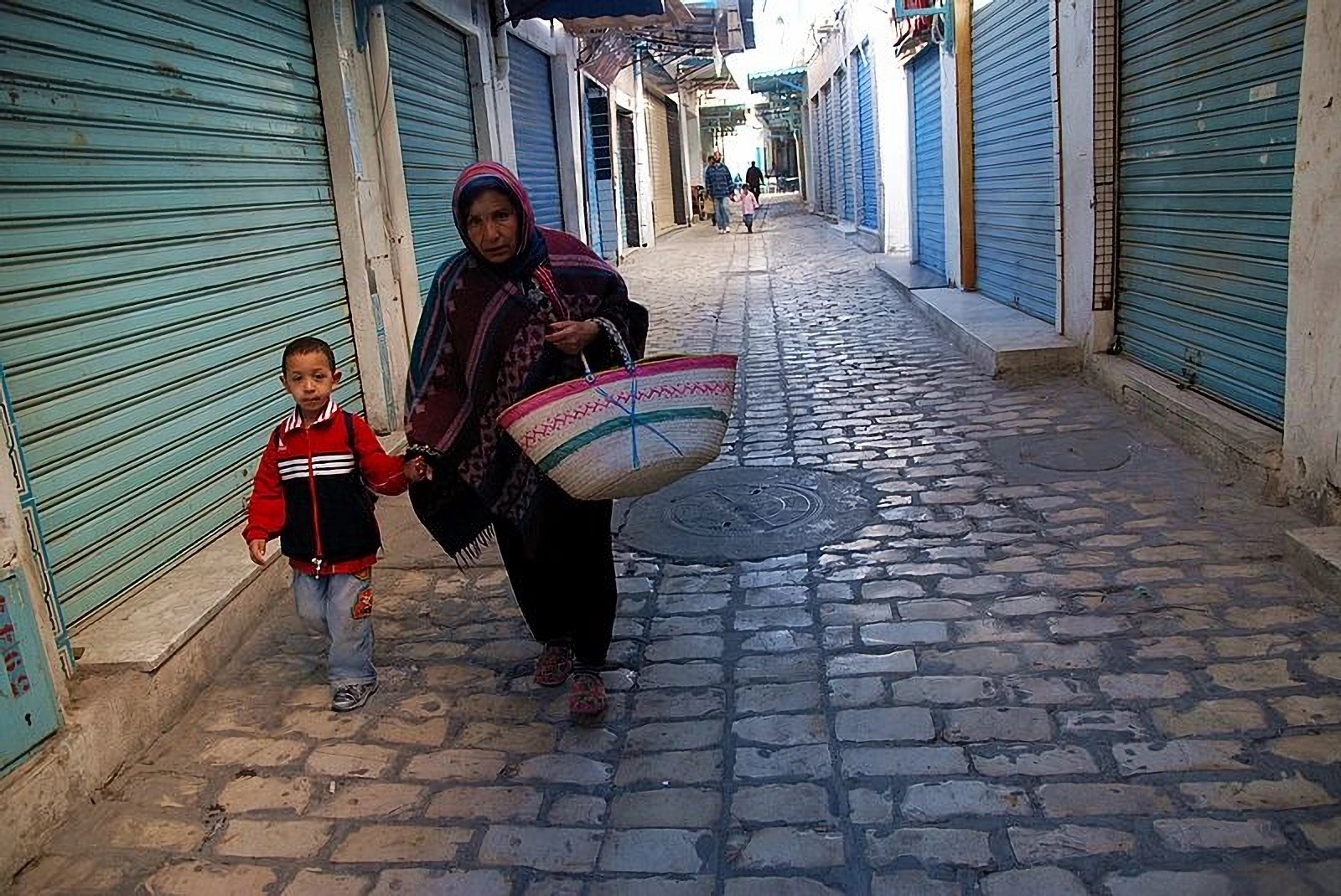 Сусс. Женщина с ребенком на улице старой Медины.