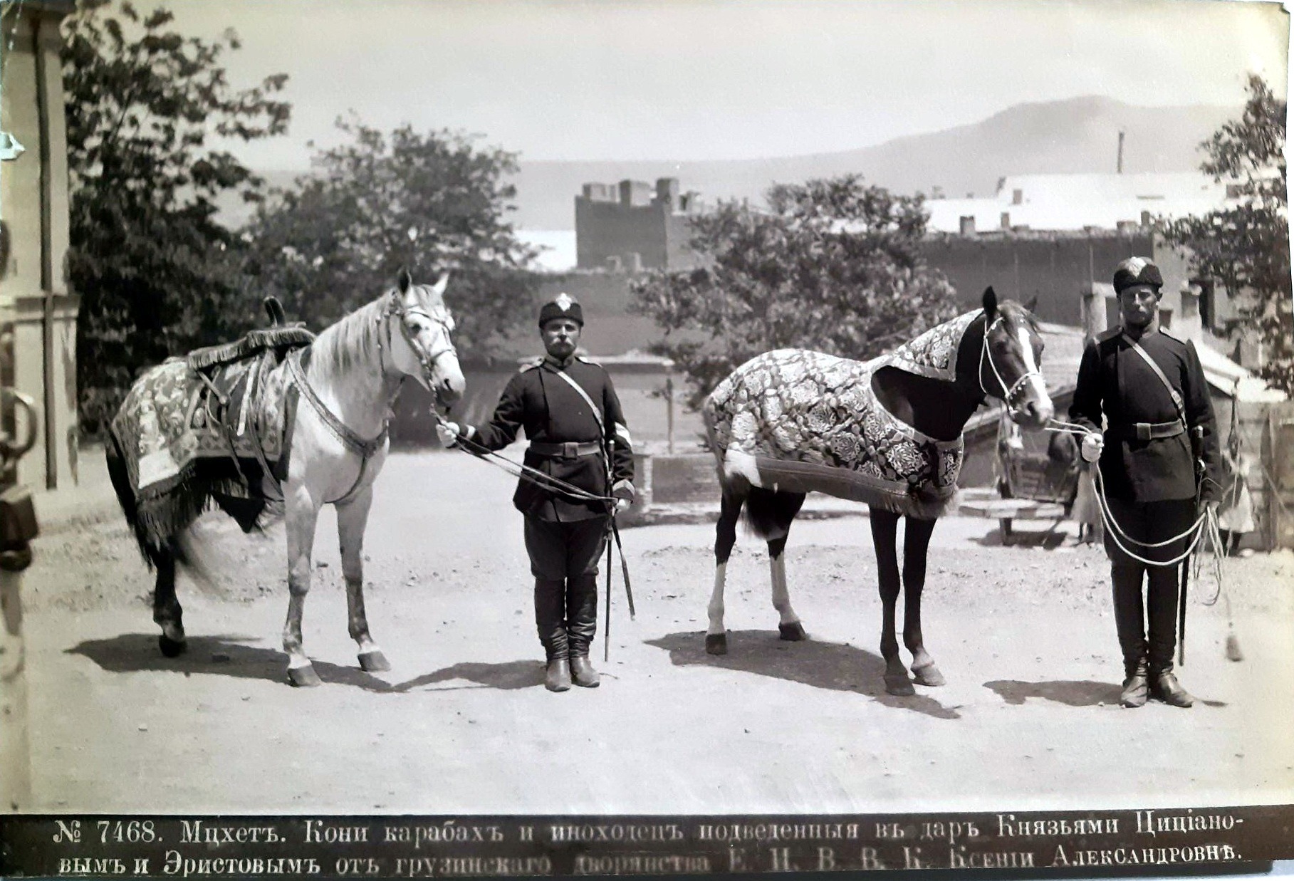 Кони Карабах и Иноходец, дар великой княгине Ксении Александровне от грузинского дворянства в Мцхете. Тифлисская губерния.
