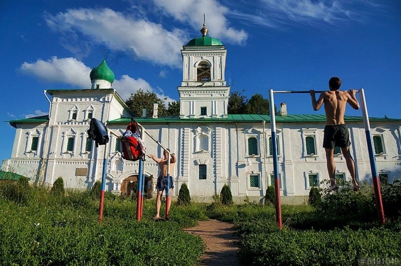 Спасо-Преображенский Мирожский Завеличский мужской монастырь. Храм Апостола и Первомученика Стефана. Молодые люди занимаются на брусьях и турнике.