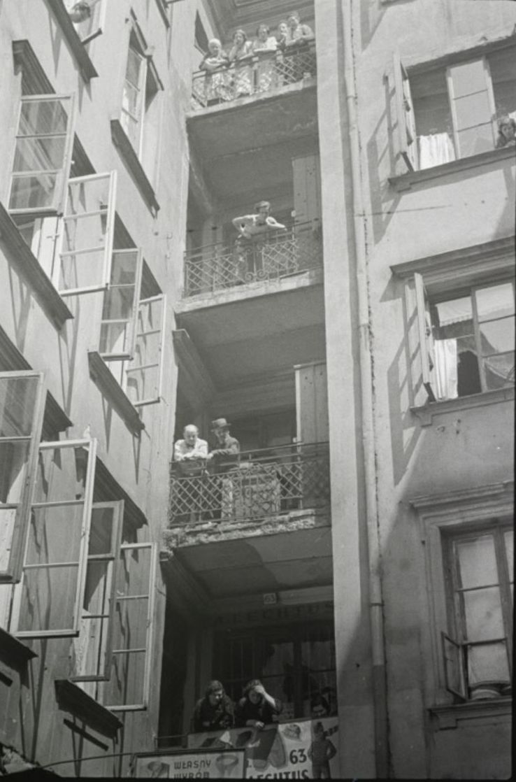 Дети ищут свет и воздух за пределами своей квартиры в подвале дома, улица Крохмальна, Варшава.