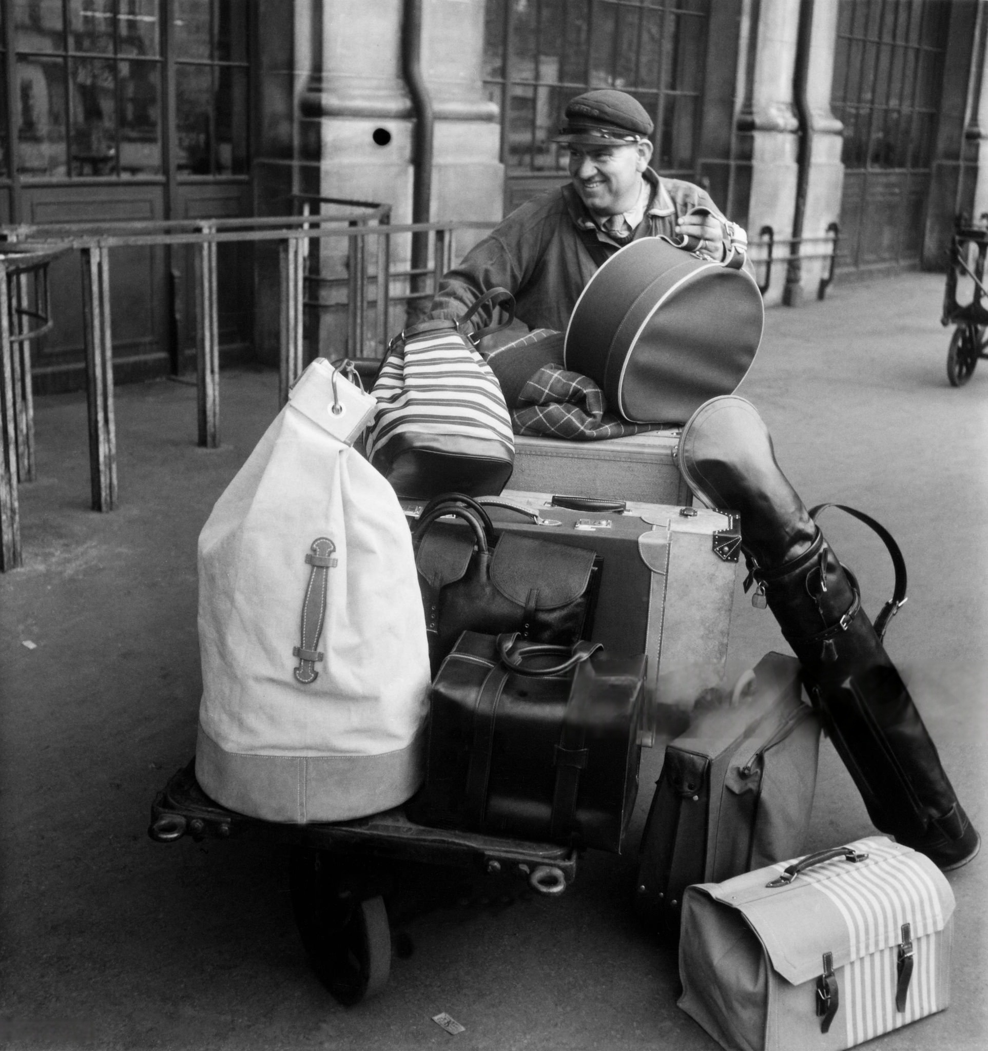 1956 год. Услуги носильщика на платформе железнодорожного вокзала.
