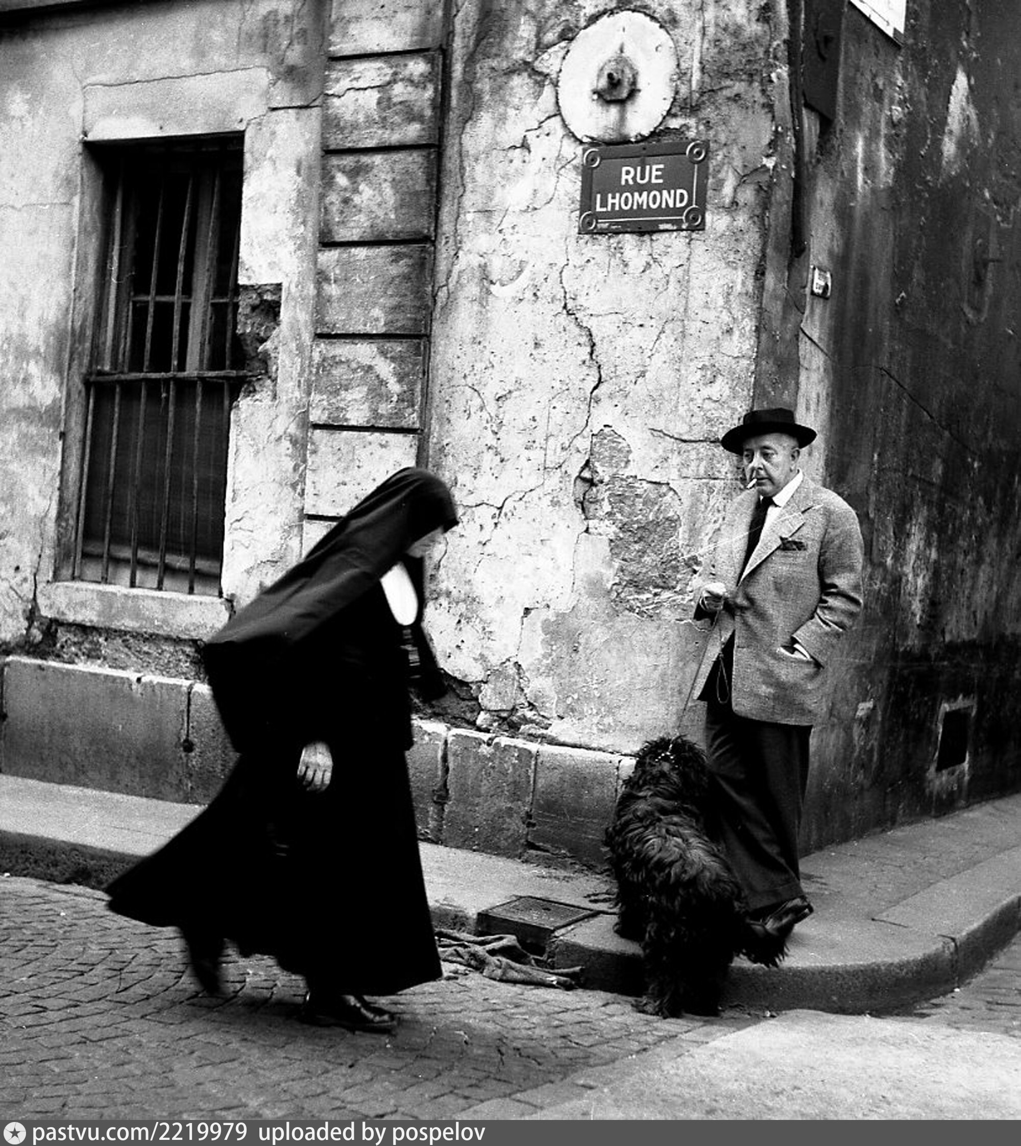 1955 год. На углу улиц Лхомонд и Рато. Жак Превер выгуливает свою собаку.