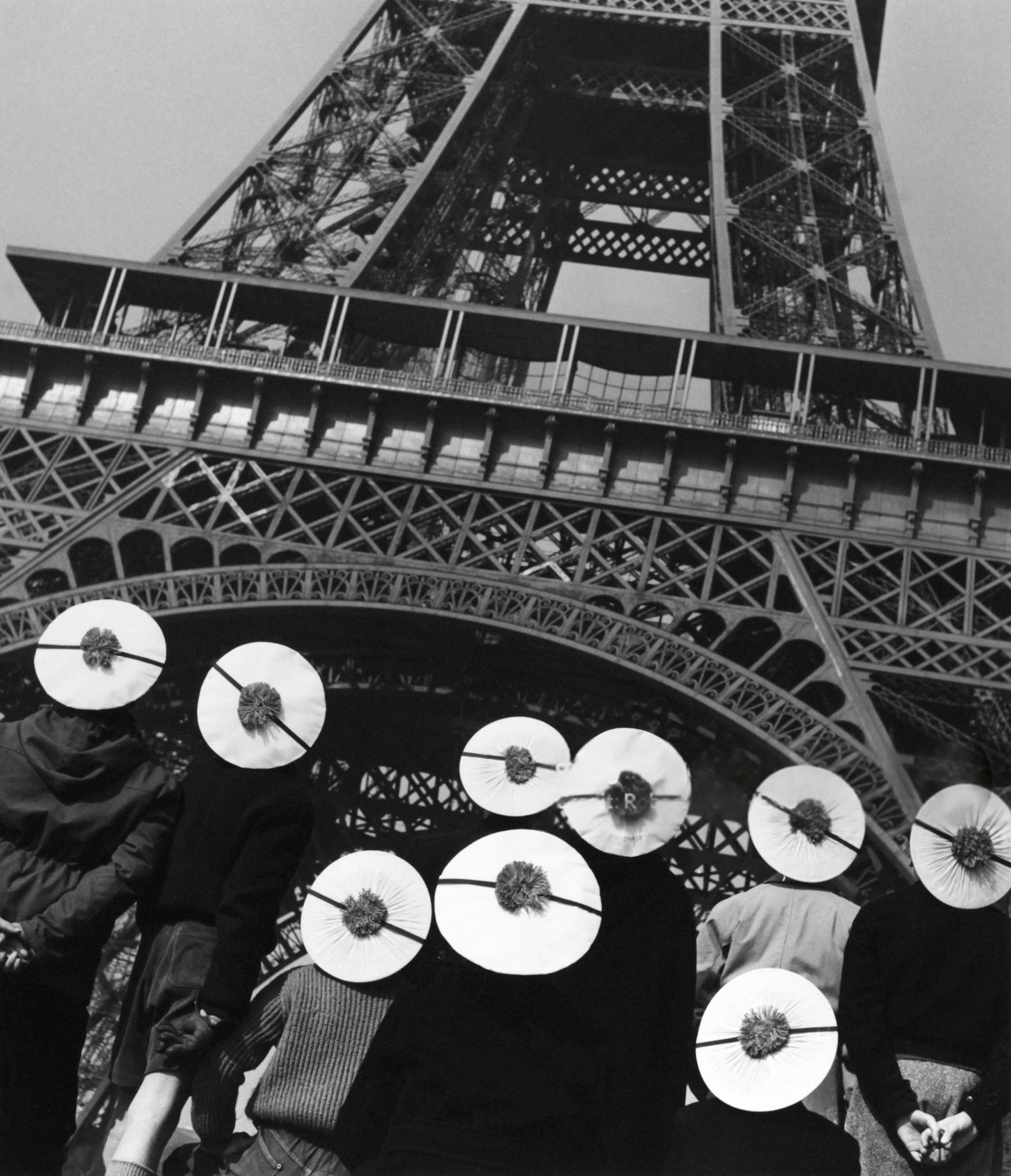 1955 год. Люди в матросских шапках на фоне Эйфелевой башни.
