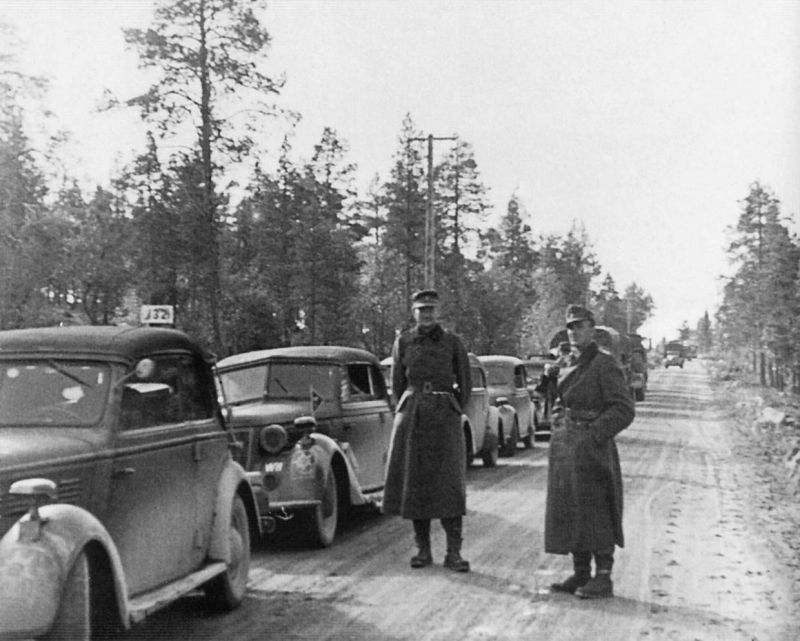 Автоколонна 20-й немецкой горной армии во время отступления из Лапландии.