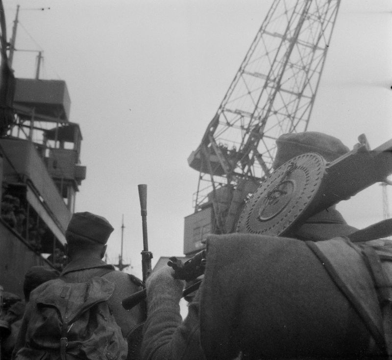 Финские пулеметчики из состава частей, выделенных для высадки десанта в Торнио, во время погрузки на транспорт в порту Оулу.