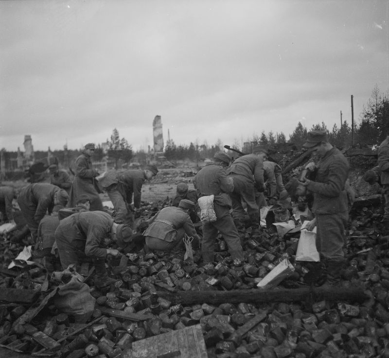 Финские солдаты разбирают сгоревший продовольственный склад в Рованиеми, подожженный отступающими немецкими войсками.