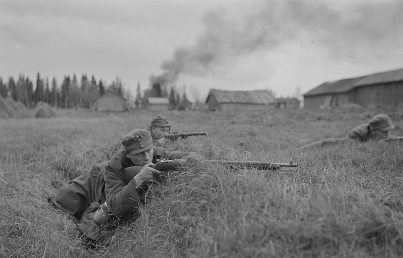 Финские пехотинцы в бою с немецкими частями во время Лапландской войны.