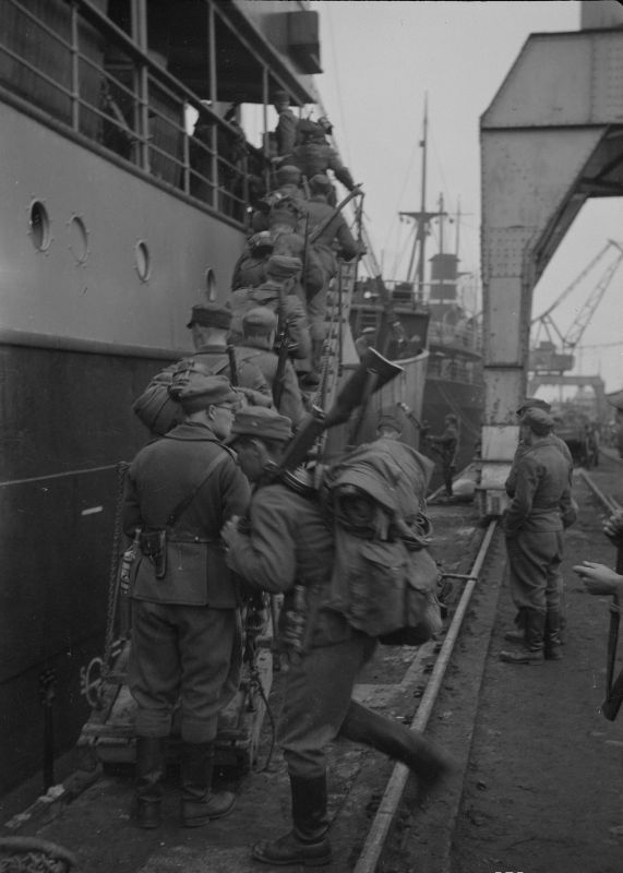 Финская пехота грузится на транспорт в порту Оулу для десантирования в Торнио.