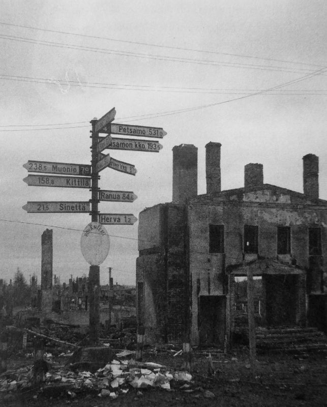 В ходе Лапландской войны немецкие войска под командованием генерала Лотара Рендулича использовали тактику «выжженной земли». В Лапландии было уничтожено 30% зданий, а город Рованиеми был разрушен до основания. Около 100 00 мирных жителей стали беженцами.