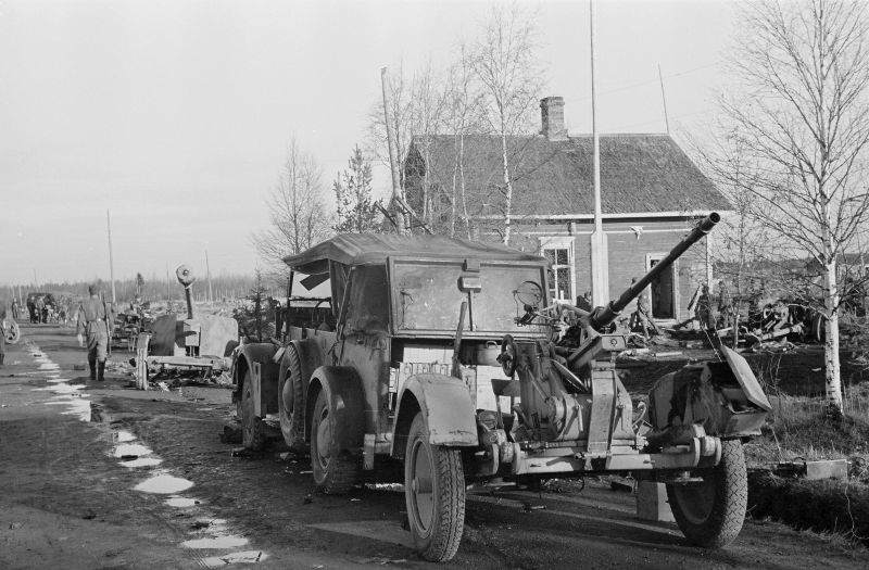 Немецкий автомобиль «Хорьх-901» и артиллерия, брошенные в деревне Карунки под Торнио.