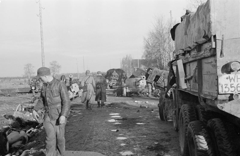 Немецкие автомобили и артиллерия, разбитые в деревне Карунки под Торнио.