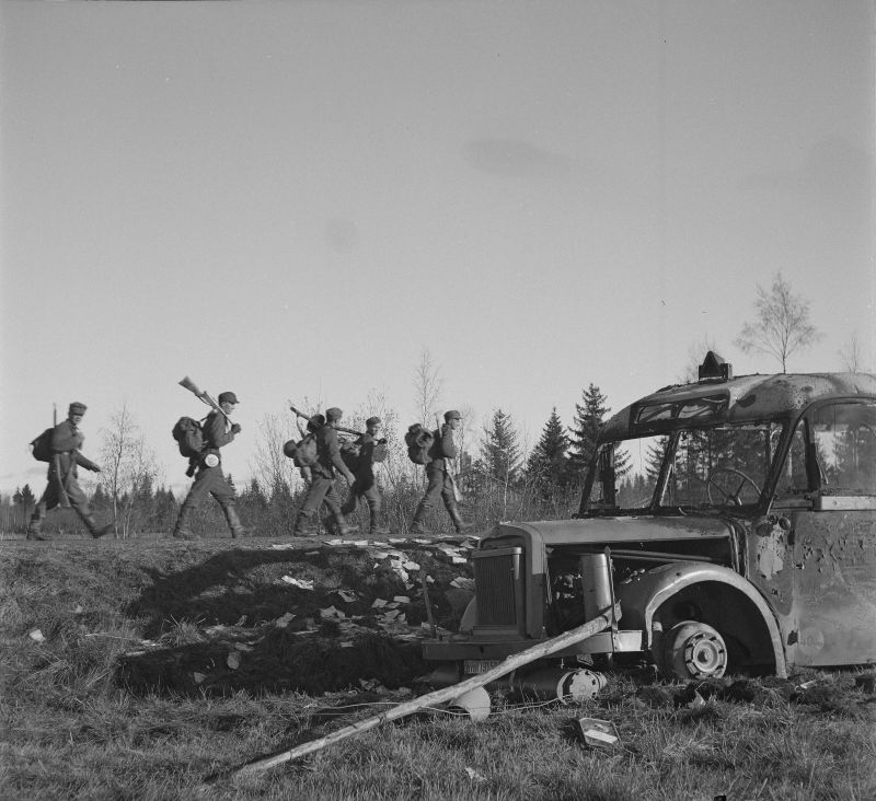 Финские солдаты проходят возле сгоревшего немецкого автобуса Gräf & Stift под Торнио.