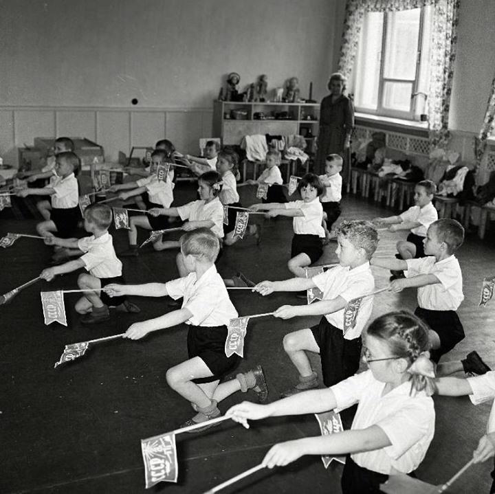 Воспитанники детского сада строителей на уроках физкультуры / 1959 год.