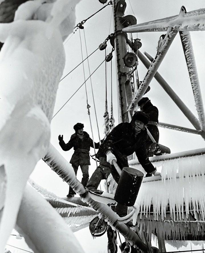Работники рыболовецкого колхоза чистят судно от льда / 1976 год.