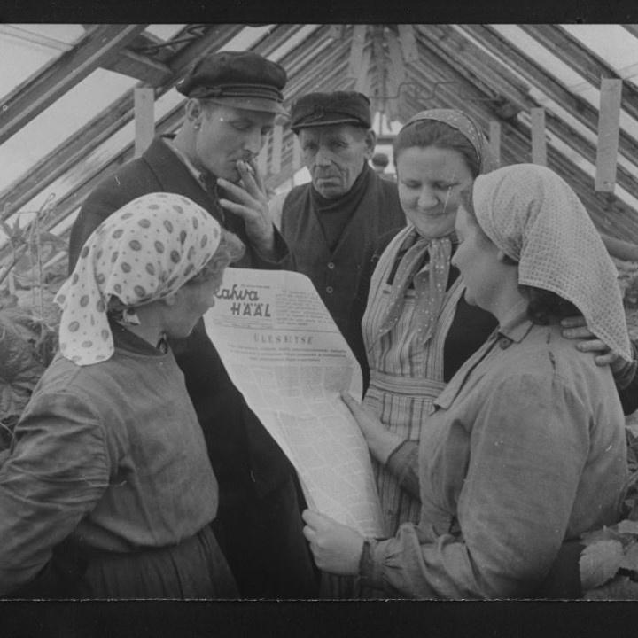 Член садовой бригады колхоза имени Калинина Харьюского района Майму Поль читает газету / 1956 год.