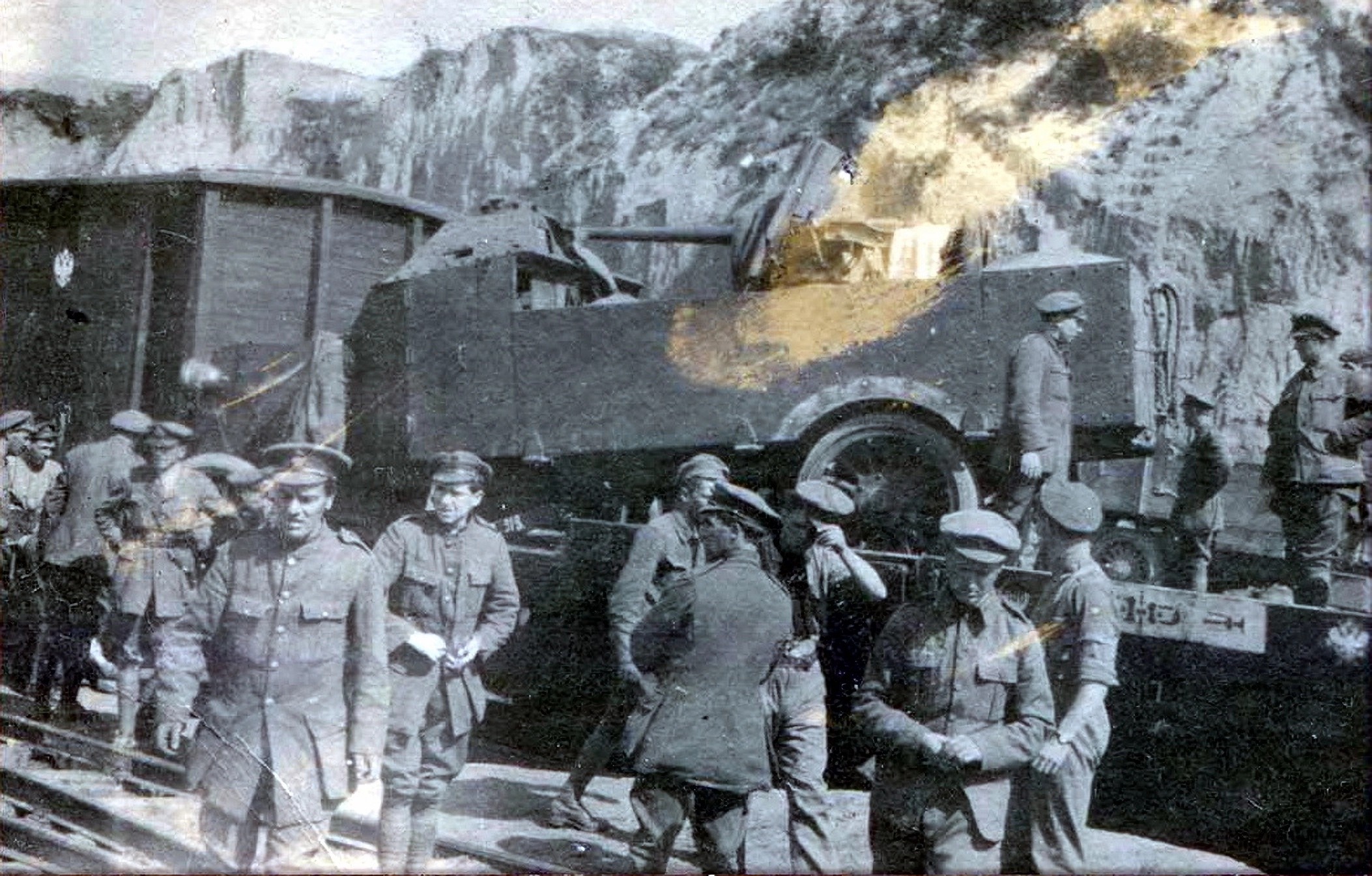 Пушечный бронеавтомобиль Сибрук на железнодорожной платформе.