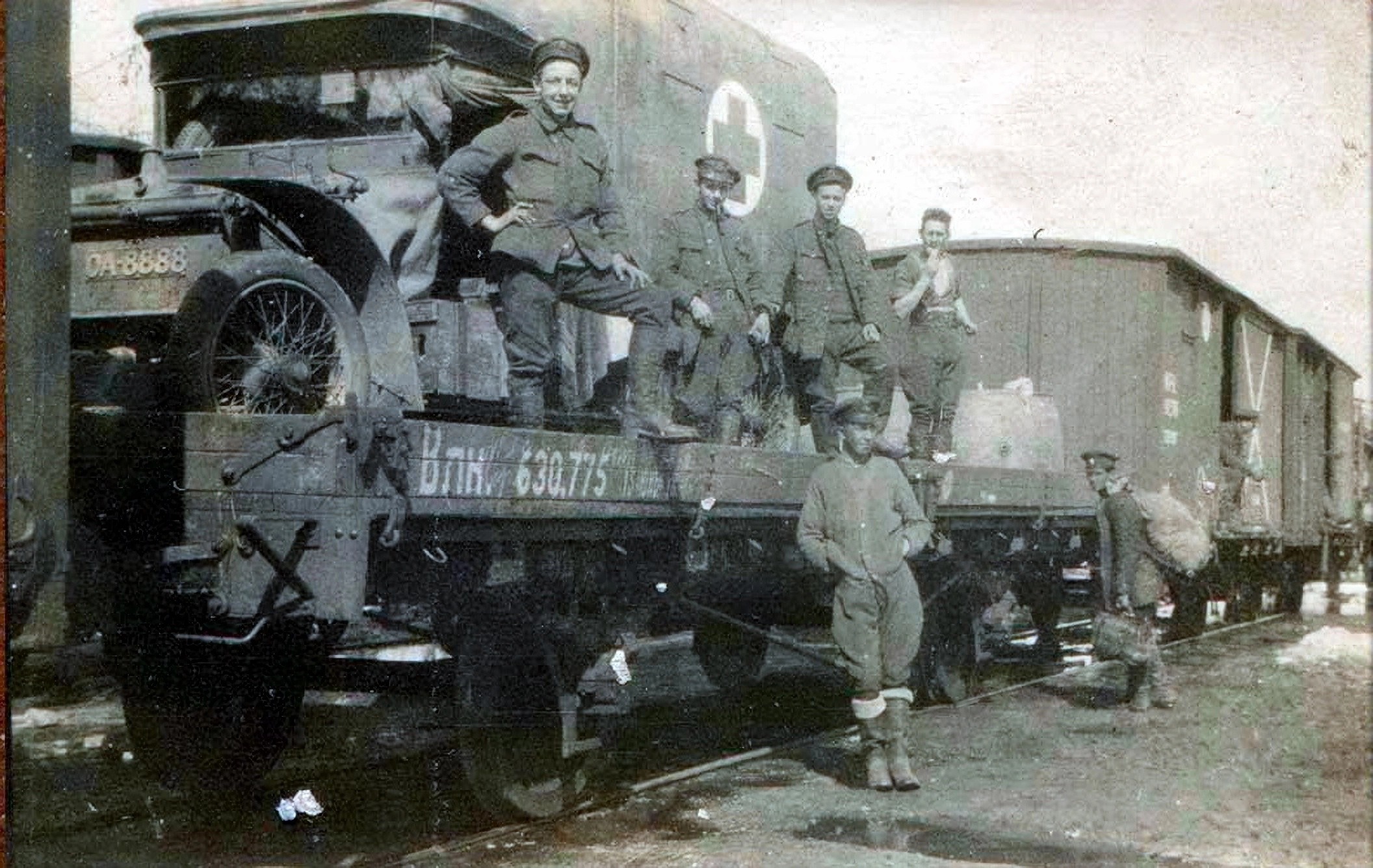 Санитарный автомобиль марки Ланчестер на железнодорожной платформе.