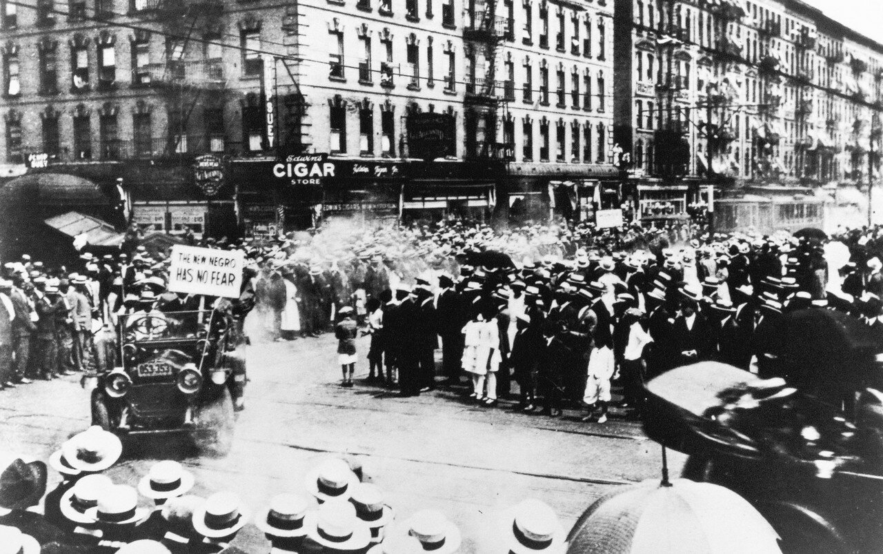 1924 год. Маркус Гарви (деятель всемирного движения негров за права и освобождение от угнетения. В 1922 году Гарви был осуждён за финансовые махинации и провёл пять лет в тюрьме, после чего потерял весь свой авторитет в негритянском движении) во время демонстрации протеста.