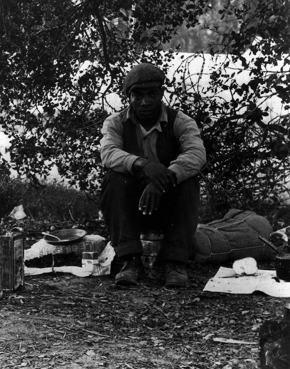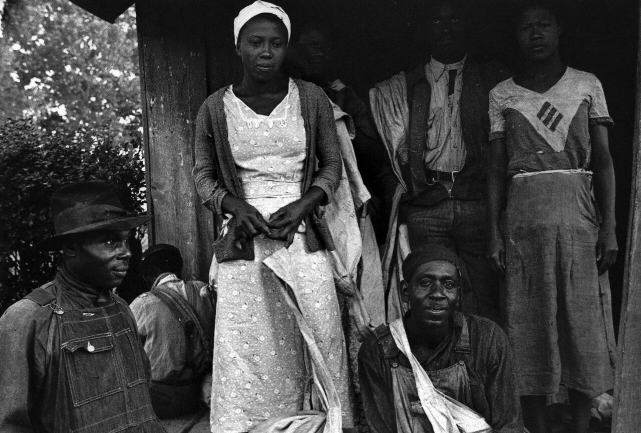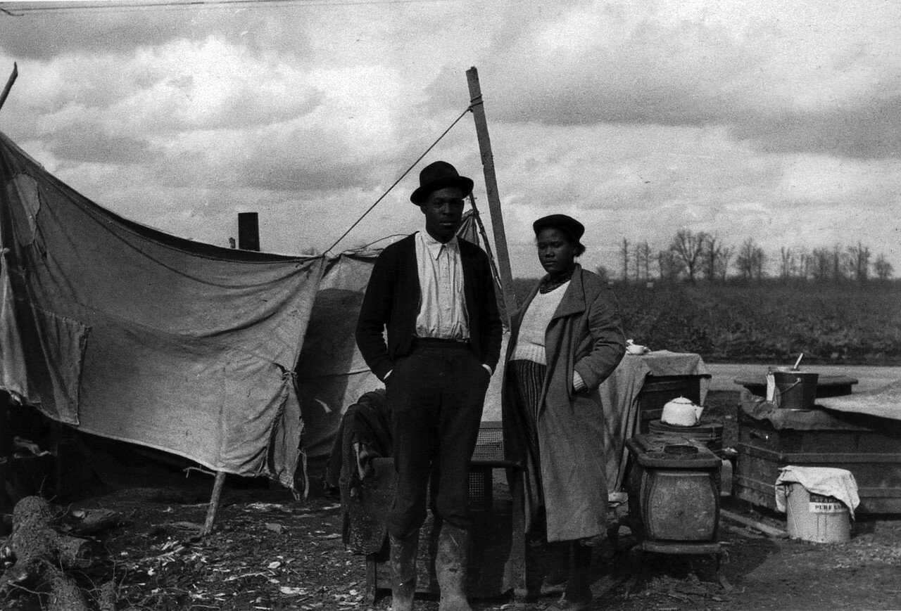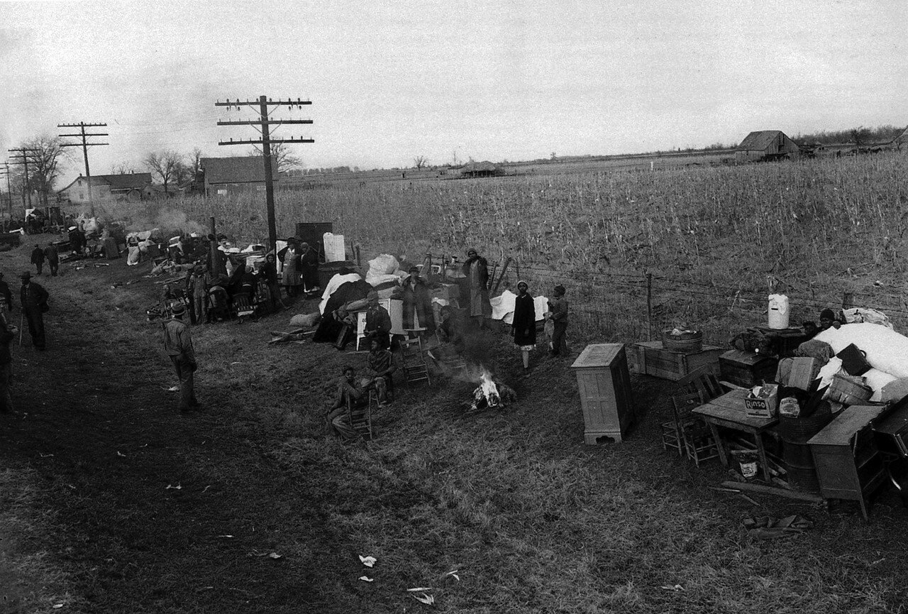1939 год. Январь. Изгнанные издольщики на шоссе 60, Миссури. На Юге США после Гражданcкой войны и отмены рабства в США плантаторы разделили свои земли на мелкие участки и сдали в аренду бывшим чернокожим рабам — кропперам. Так к концу 1870-х годов основная масса негров стала издольщиками-кропперами у крупных землевладельцев, которые давали им сельхозинвентарь и руководили полевыми работами, забирая за это часть урожая.