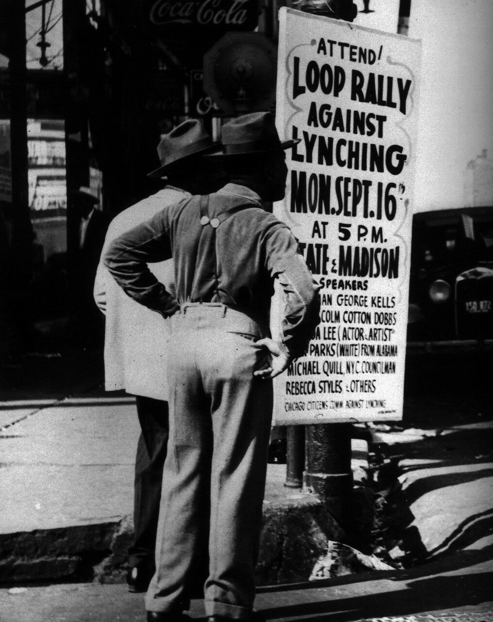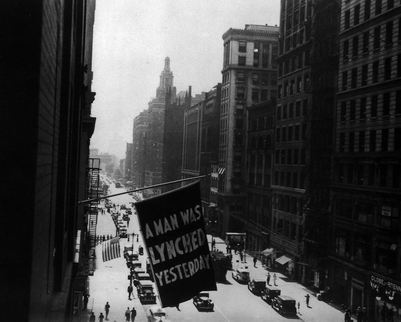 1938 год. 5 Авеню, Нью-Йорк. На флаге написано: «Вчера был линчеван мужчина».