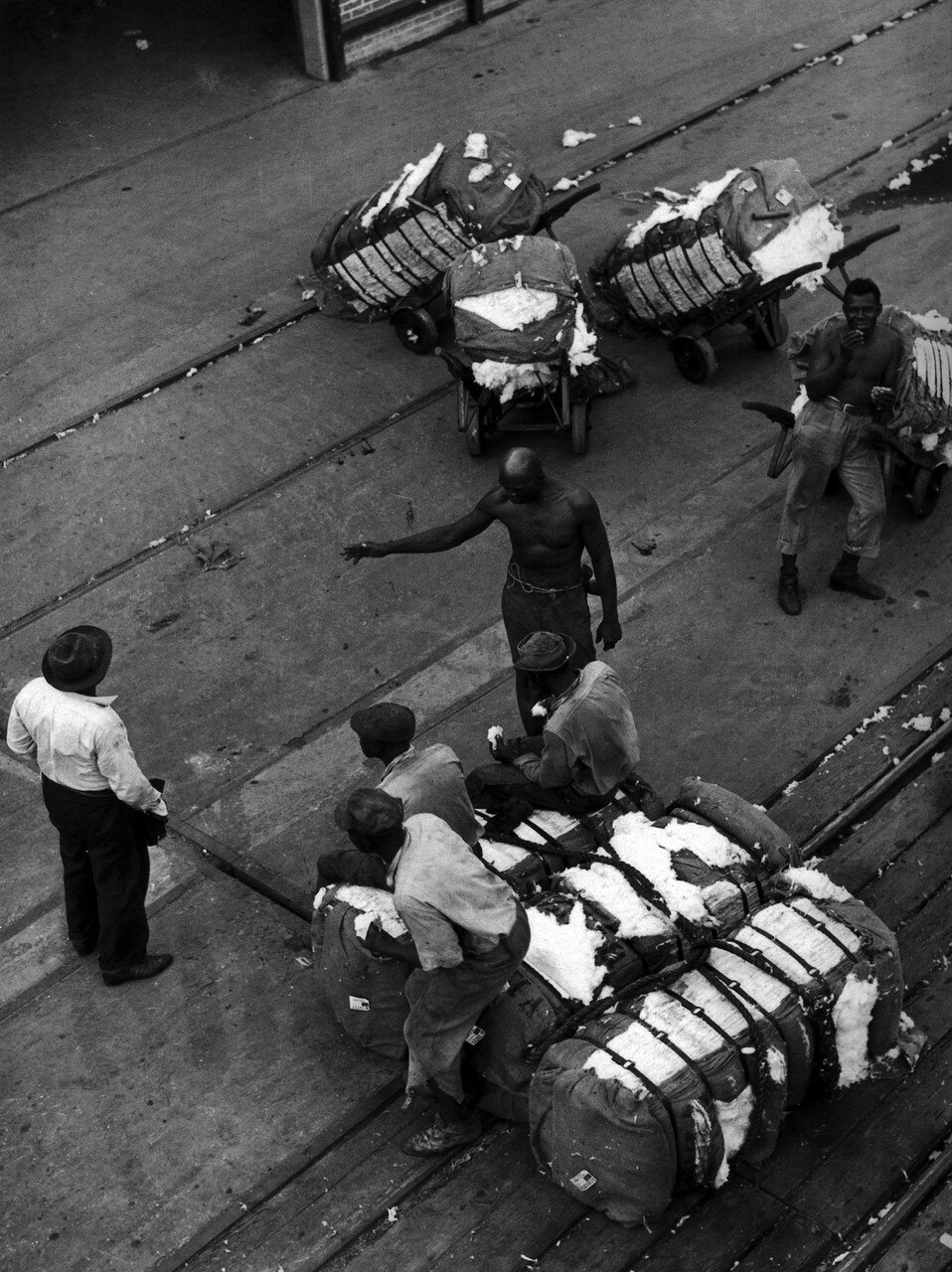 1939 год. Октябрь. Грузчики с тюками хлопка на причале в Хьюстоне.