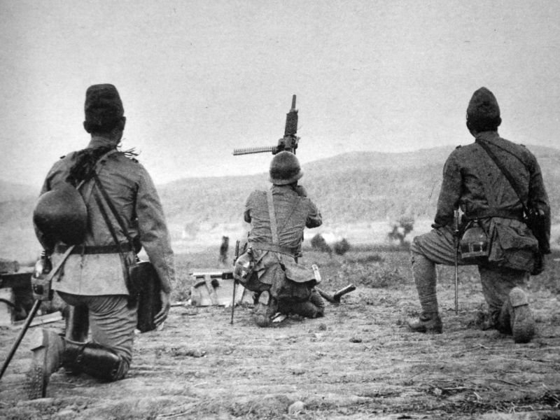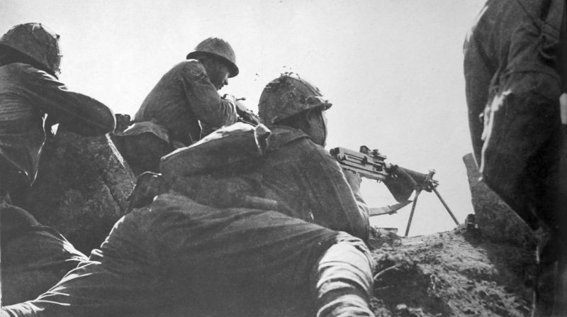 Японский солдат ведет огонь по воздушным целям из пулемета Тип 92.