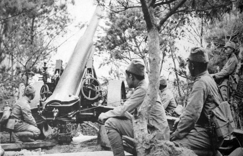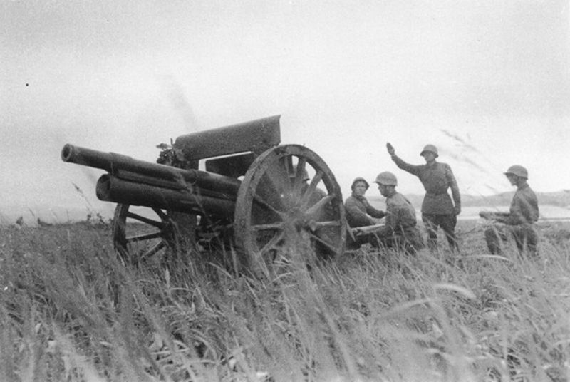 Японские артиллеристы готовятся произвести выстрел из 150-мм пушки тип 89 во время боев у озера Хасан.