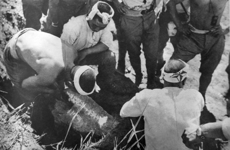 Советские военнослужащие разбирают японские трофеи после Хасанских боев.