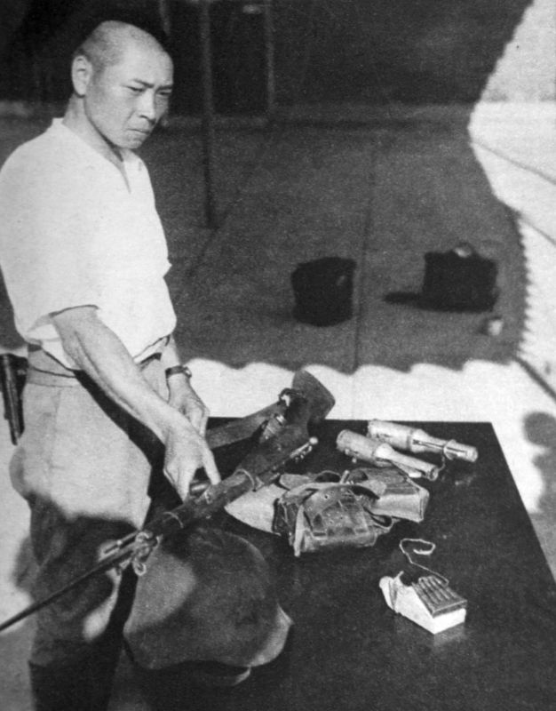 Японский офицер демонстрирует трофейное вооружение и каску бойца РККА.