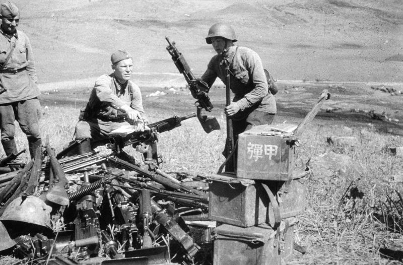 Советские военнослужащие осматривают трофейное японское стрелковое оружие.