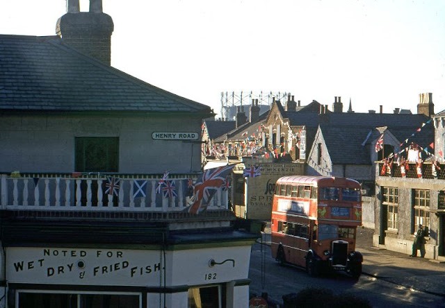 Перекресток Ист-Барнет-роуд и Генри-роуд, украшенный коронационными украшениями, Лондон.